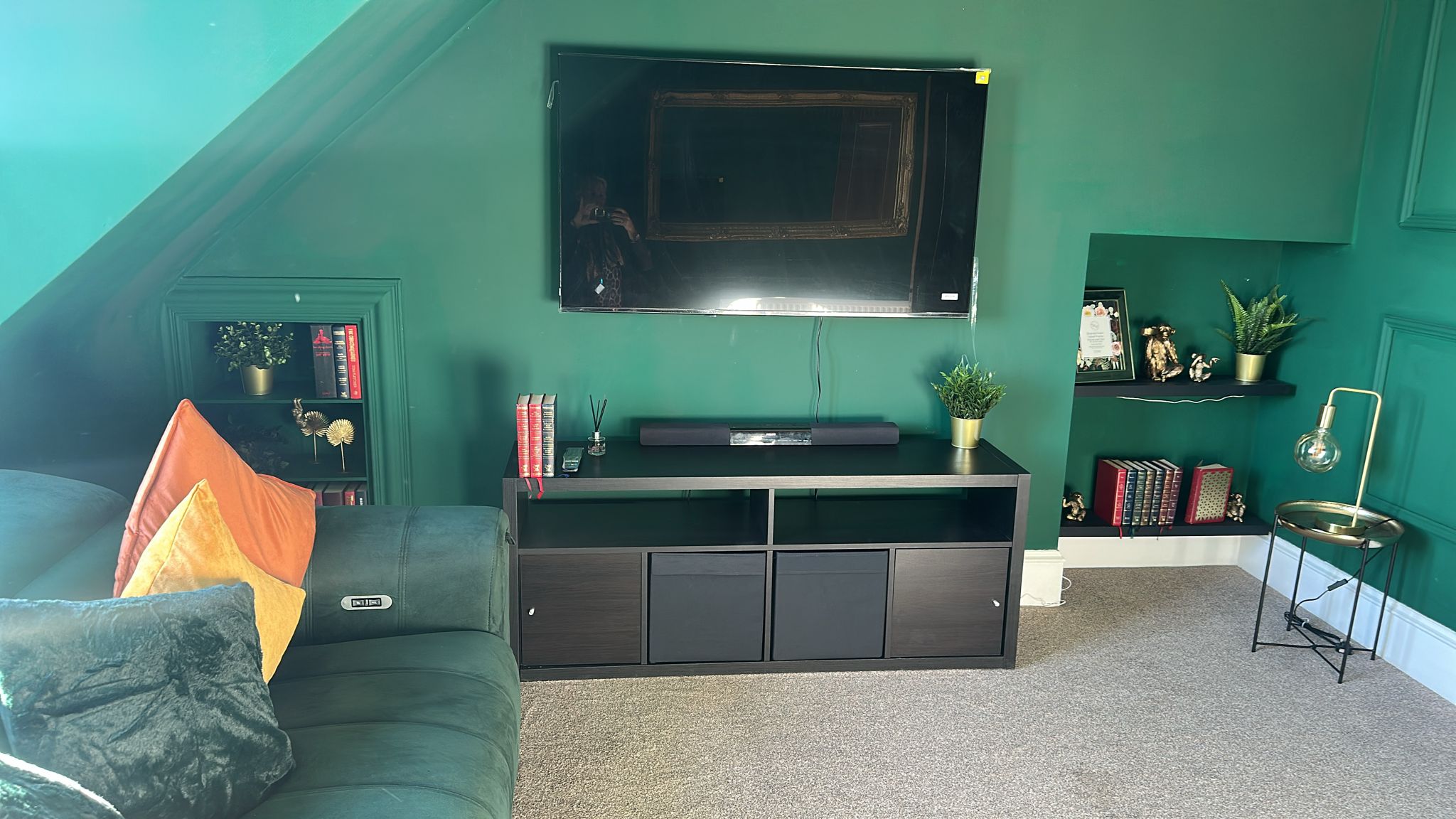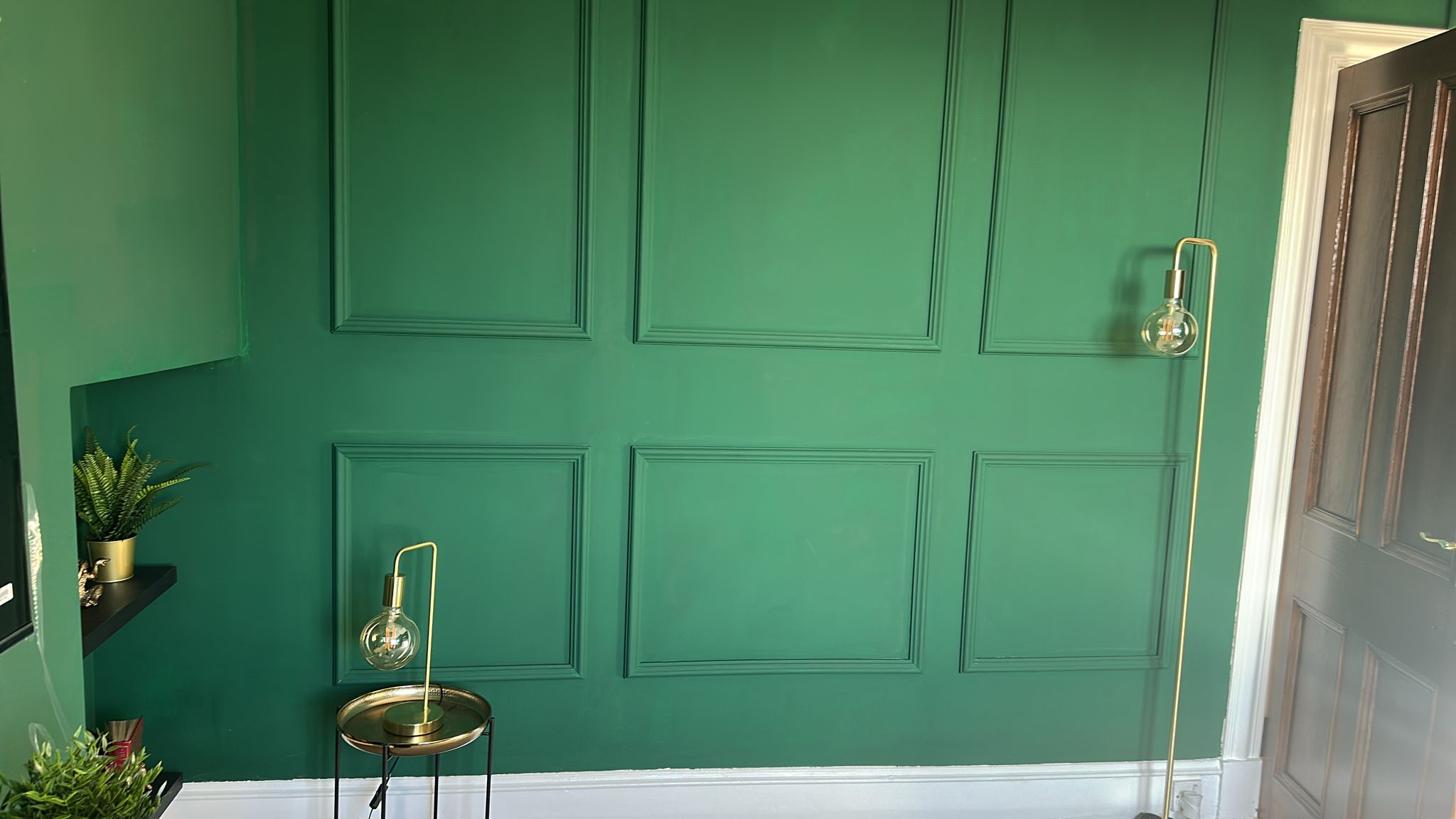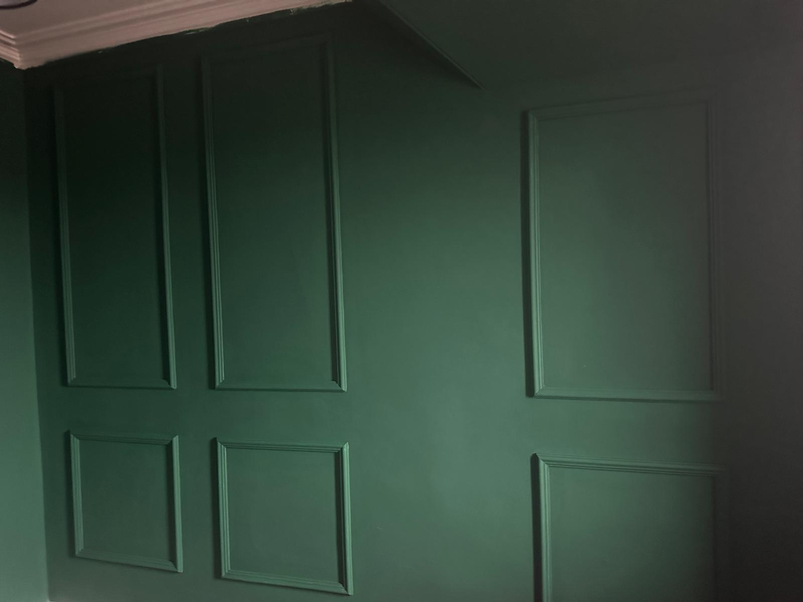 The lounge is bright and welcoming, featuring deep green panelled walls, gold accents, and ample natural light. The adjoining galley-style kitchen comes equipped with an oven, fridge-freezer, and plenty of storage. The double bedroom continues the period theme with rich wall panelling, while the bathroom offers an over-bath shower and tasteful modern fittings.