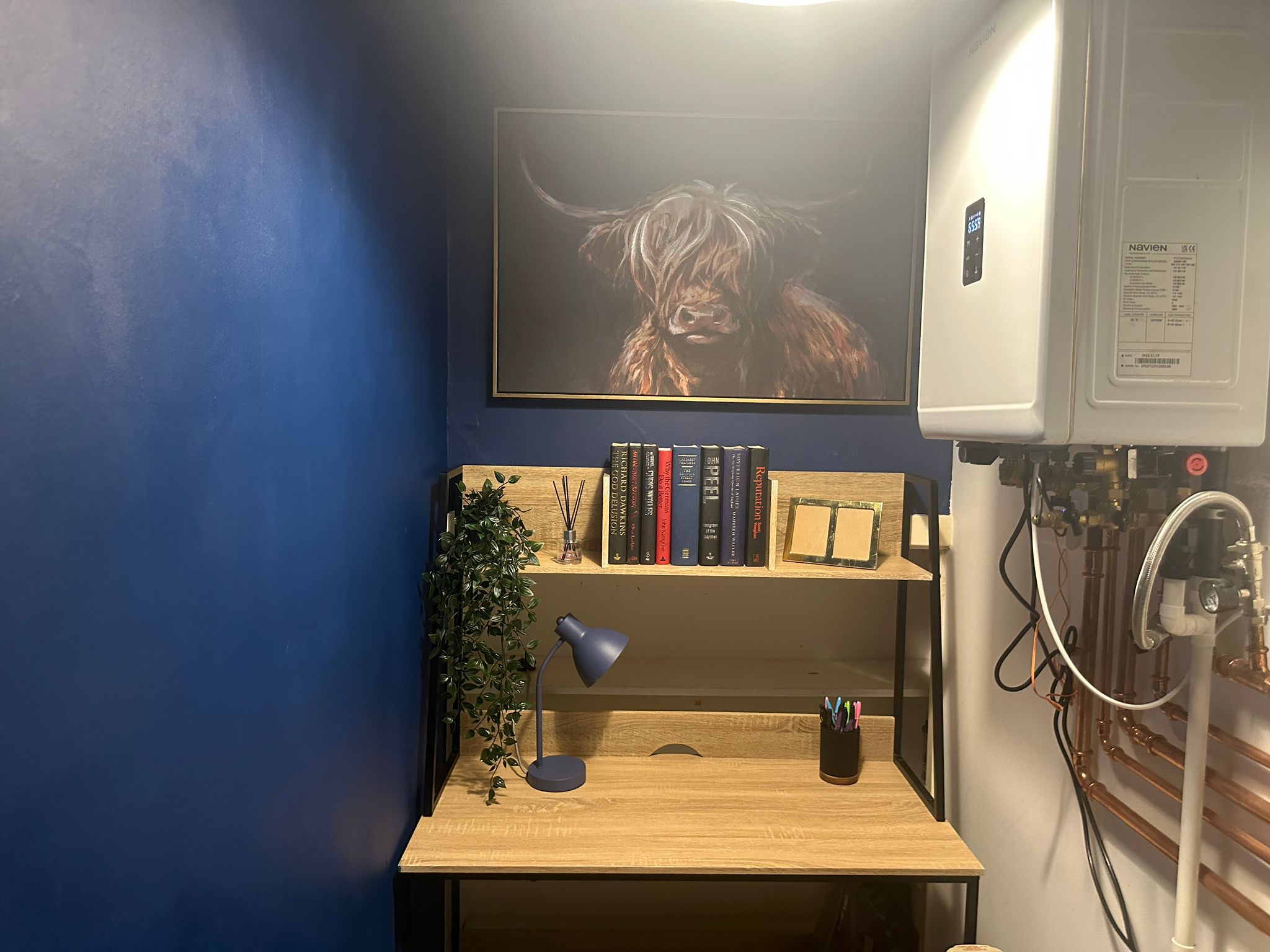 A thoughtfully designed study nook makes excellent use of the boiler room, providing a perfect workspace. The property also benefits from gas central heating, double glazing, and access to a shared rear garden / drying green. On-street parking is available to the front.